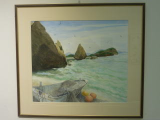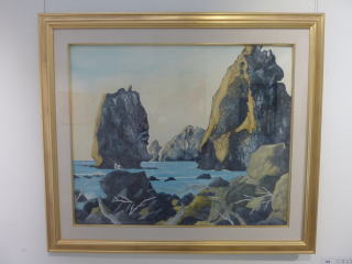 | 菊地 利治「朝陽に輝くローソク岩」 水彩 |